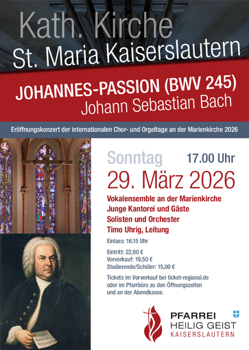 Sonntag, 29.03.2026 Uhrzeit: 17.00 Uhr Kaiserslautern, MarienkircheBach: Johannes-Passion (BWV 245)
