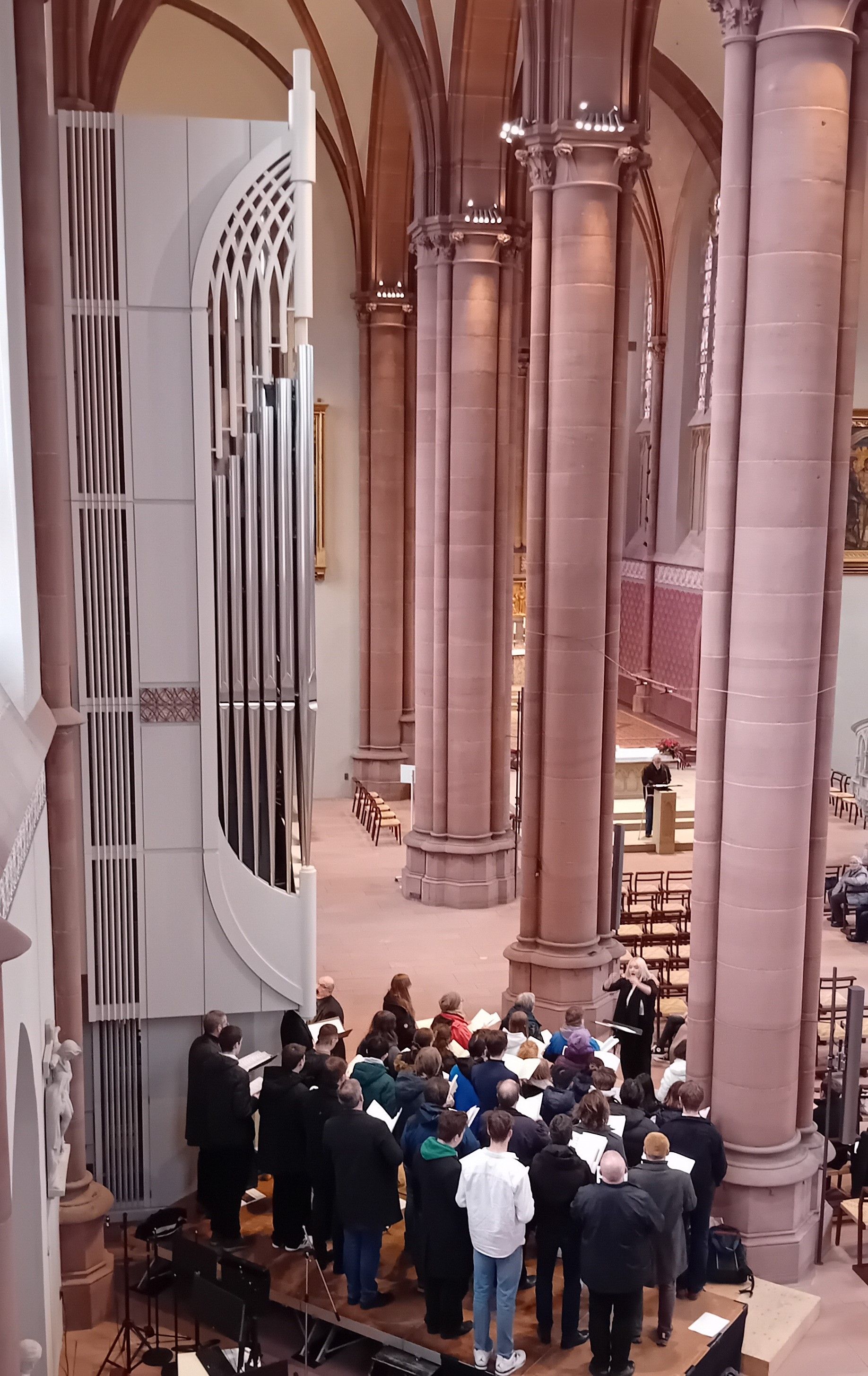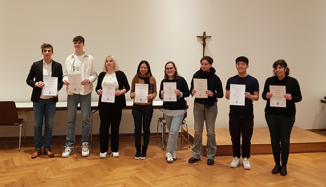 Gemeinsam gestalteten die angehenden und bereits fertigen Kirchenmusikerinnen und -musiker ein Mittagsgebet unter der liturgischen Leitung von Dr. Thomas Kiefer, dem Leiter der Hauptabteilung I Seelsorge im Bischöflichen Ordinariat, zu dem auch die Abteilung Kirchenmusik gehört. In diesem an einem Stundengebet orientierten Gottesdienst kam neben dem Chor- und Sologesang auch die neue, unlängst eingeweihte Chororgel in St. Maria zum Einsatz. Die Absolventinnen und Absolventen sowie fortgeschrittenen Schülerinnen und Schüler übernahmen das Dirigat des Gemeinschaftschors sowie solistische Beiträge mit Gesang, Violine und Orgel. Neben dem Schülerchor, der durch Gastsängerinnen und -sänger sowie Lehrkräfte verstärkt wurde, fanden sich erfreulicherweise auch einige Besucher ein, die von der Musik sichtlich begeistert den Gottesdienst mitfeierten. Dr. Thomas Kiefer nahm in seiner Ansprache Bezug auf die Lesung aus dem Römerbrief (Röm 5,1-5), wo es um die Hoffnung der Glaubenden geht, die nicht zuletzt durch die Kirchenmusik den Menschen spürbar und erfahrbar und eben auch hörbar gemacht wird. Dr. Kiefer stellte Bezüge bekannter Werke und Lieder von der klassischen Oper bis zum aktuellen Popsong her. Nach der gottesdienstlichen Feier ging es nahtlos in die Zeugnisfeier im benachbarten Pfarrheim über. Dr. Kiefer und Diözesankirchenmusikdirektor Martin Erhard, der die Abteilung Kirchenmusik und das BKI als Ganzes leitet, überreichten nach einer kurzen Dankesrede die Abschlusszeugnisse an die Absolventinnen und Absolventen sowie Jahreszeugnisse an die momentan in der Ausbildung befindlichen Schülerinnen und Schüler.