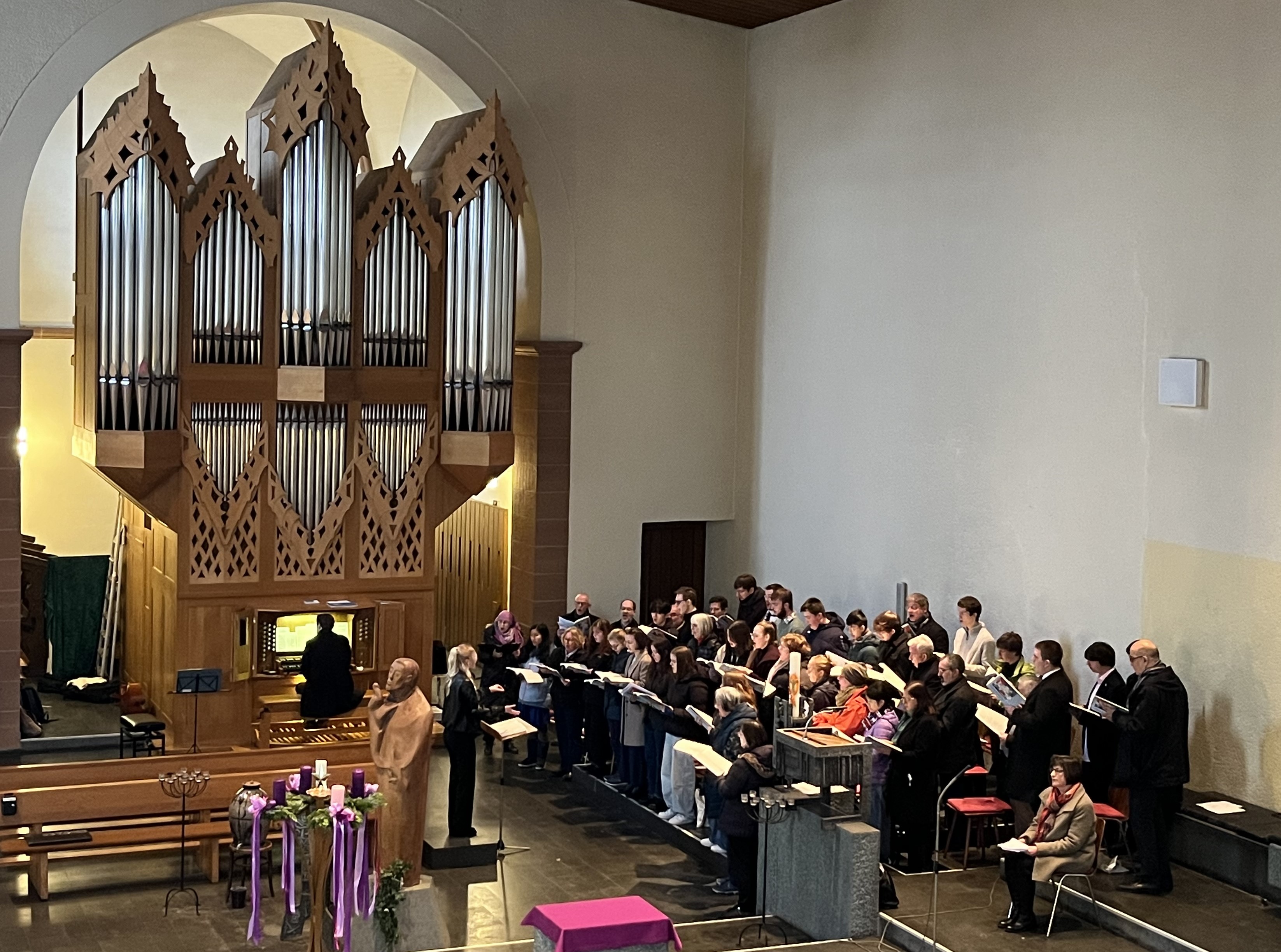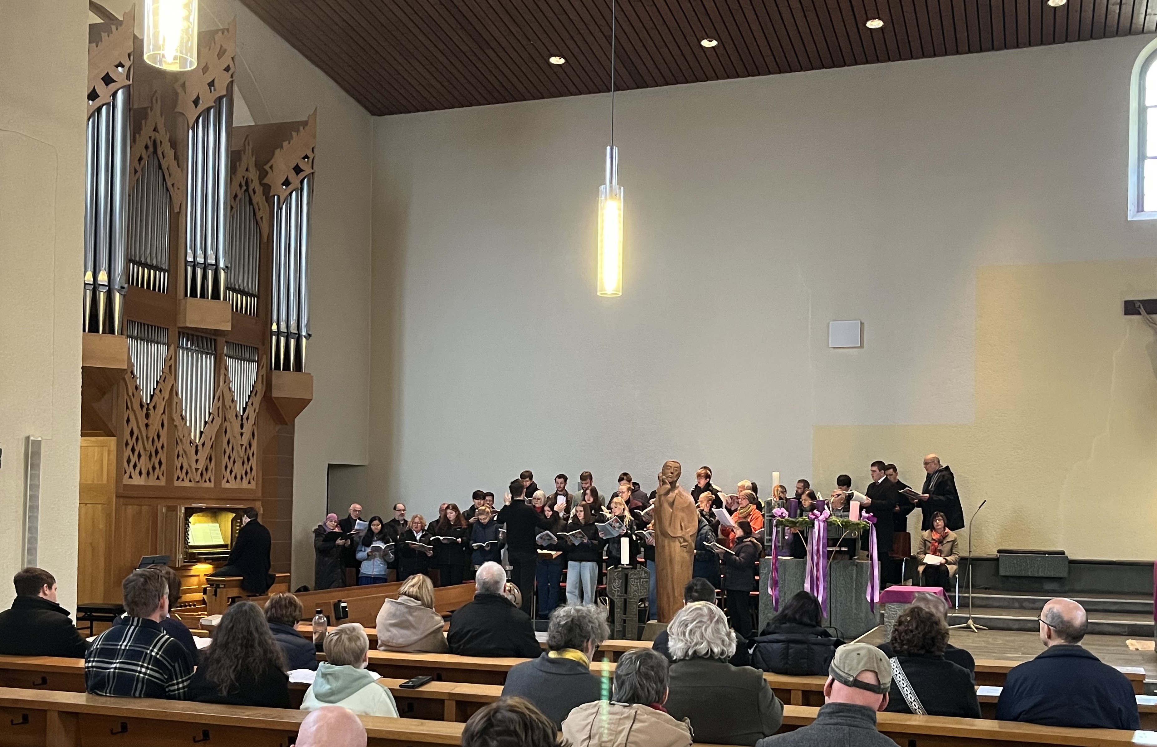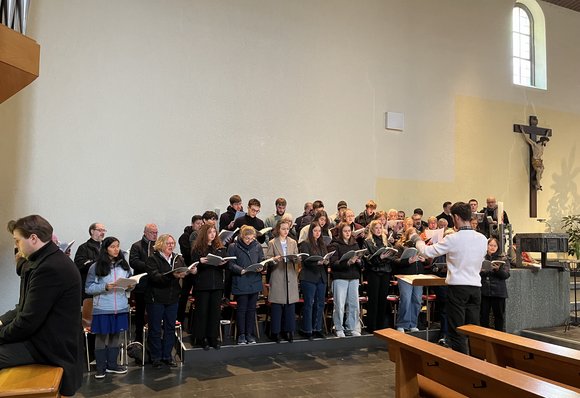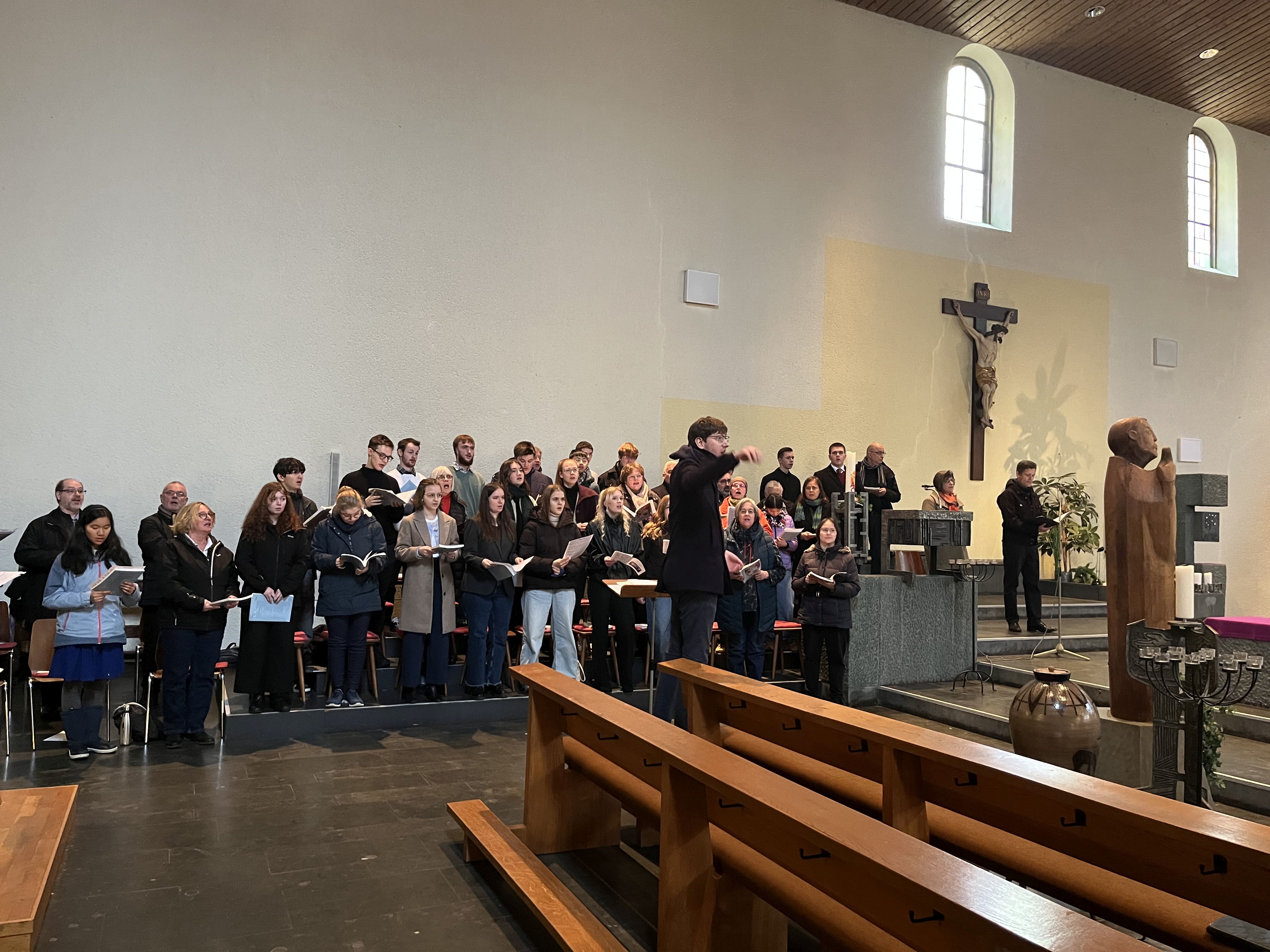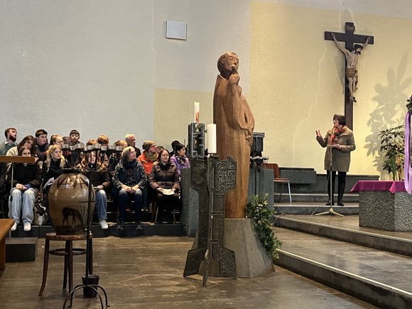 Gemeinsam gestalteten die angehenden und bereits fertigen nebenamtlichen Kirchenmusikerinnen und -musiker zusammen mit den BKI-Dozenten und Gastsingenden ein Mittagsgebet unter der liturgischen Leitung von Kerstin Fleischer, der Leiterin der Hauptabteilung Seelsorge im Bischöflichen Ordinariat, zu welchem auch die Abteilung Kirchenmusik gehört. Die Räumlichkeiten der Franziskuskirche boten für diesen an einem Stundengebet orientierten Gottesdienst optimale Bedingungen: Der Chor konnte neben dem Altarraum Aufstellung nehmen und von der ebenfalls in Altarraumnähe befindlichen Orgel begleitet werden. Die Absolventinnen und Absolventen sowie fortgeschrittenen Schülerinnen und Schüler übernahmen das Dirigat des Gemeinschaftschors sowie solistische Beiträge mit Orgelsolo oder Cello und Orgel.