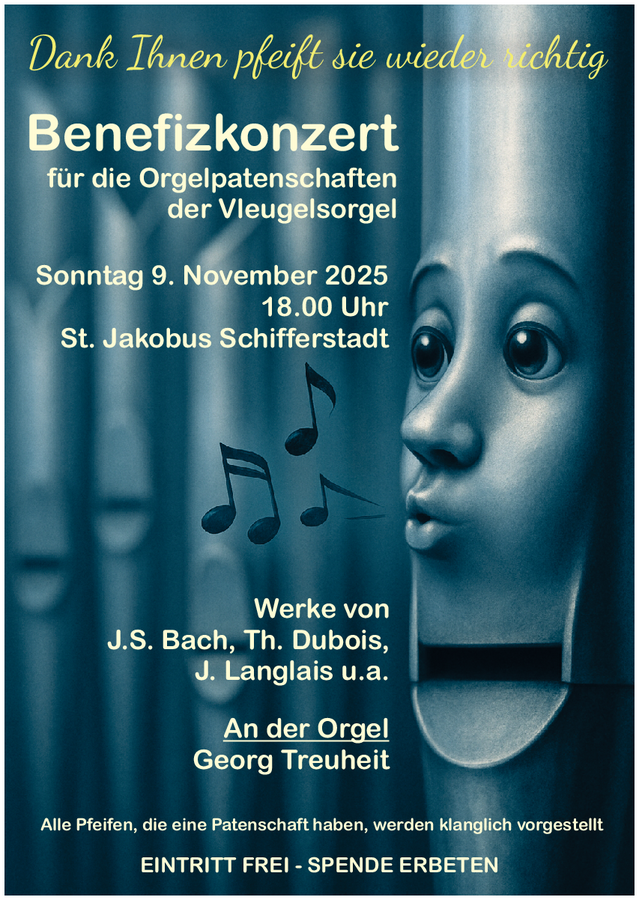 Am Sonntag, 9. November 2025, um 18 Uhr lädt die Pfarrei St. Jakobus Schifferstadt zu einem besonderen Konzert ein: Unter dem Motto „Dank Ihnen pfeift sie wieder richtig“ erklingt die Vleugelsorgel zu einem festlichen Benefizkonzert zugunsten der Orgelpatenschaften.