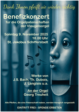 Das Konzert ist zugleich ein Dank an alle, die mit ihrer Spende zur Restaurierung und Erhaltung der Vleugelsorgel beigetragen haben. Im Anschluss lädt der Förderverein Kirchenmusik an St. Jakobus Schifferstadt e.V. zu einem Glas Sekt im Foyer des Pfarrheims ein – als Zeichen der Wertschätzung und Gelegenheit zum Austausch.