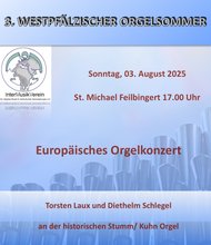 Am Sonntag, 3. August 2025, findet um 17 Uhr in der Katholischen Kirche St. Michael in Feilbingert ein besonderes EUROPÄISCHES ORGELKONZERT mit Dekanatskantor Diethelm Schlegel (Dekanate Donnersberg und Kusel) und Torsten Laux (Professor für Orgel in Düsseldorf und Dozent für Klavier und Orgel am Bischöflichen Kirchenmusikalischen Institut des Bistums Speyer) statt.